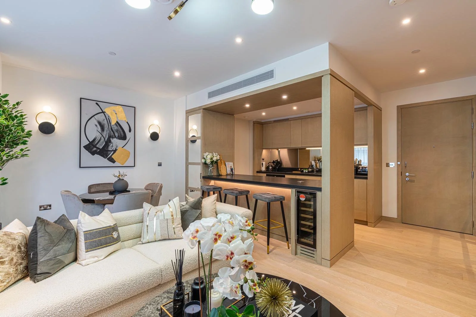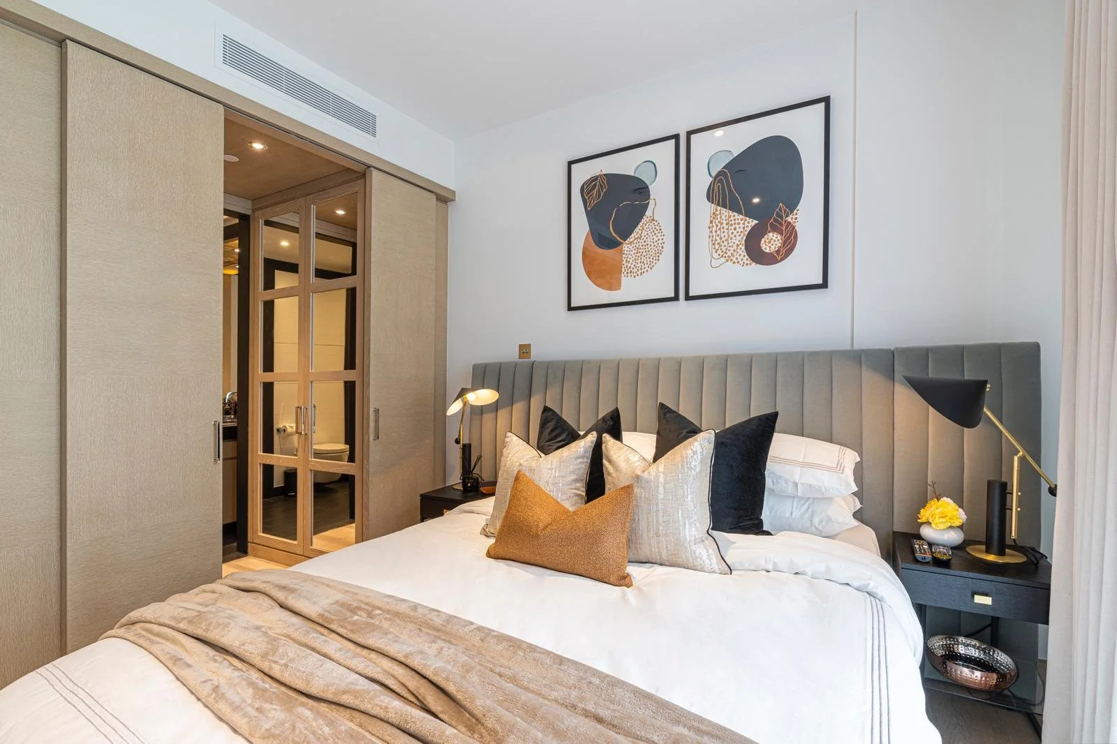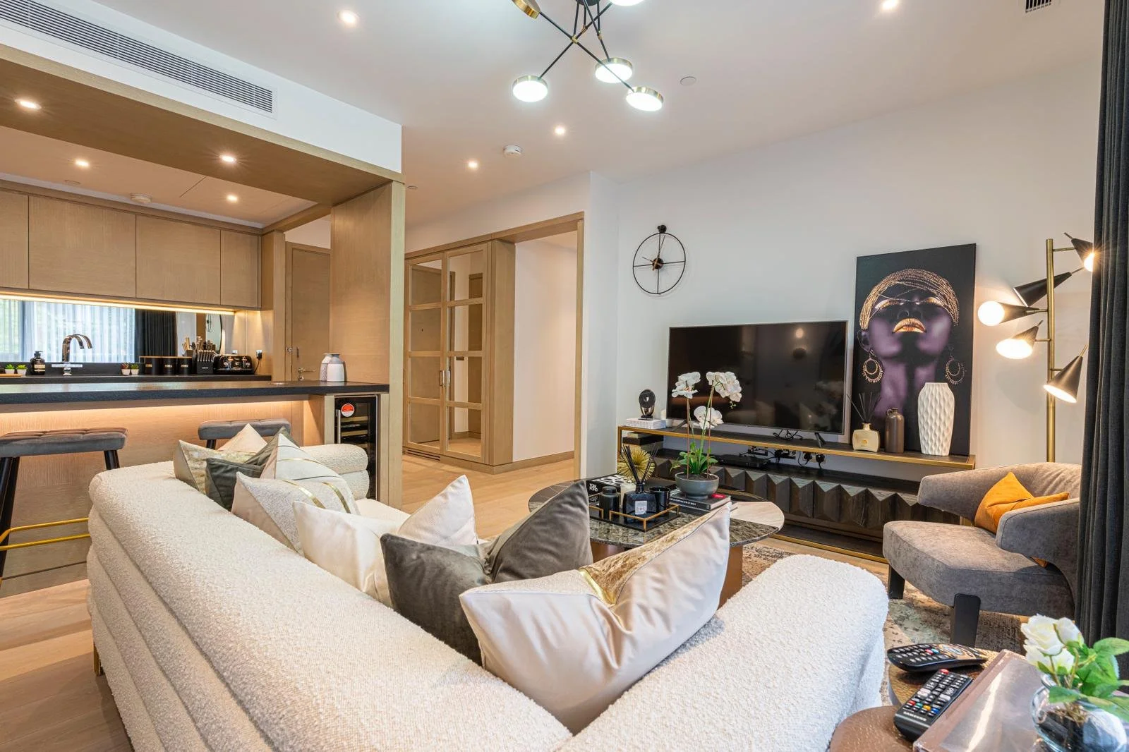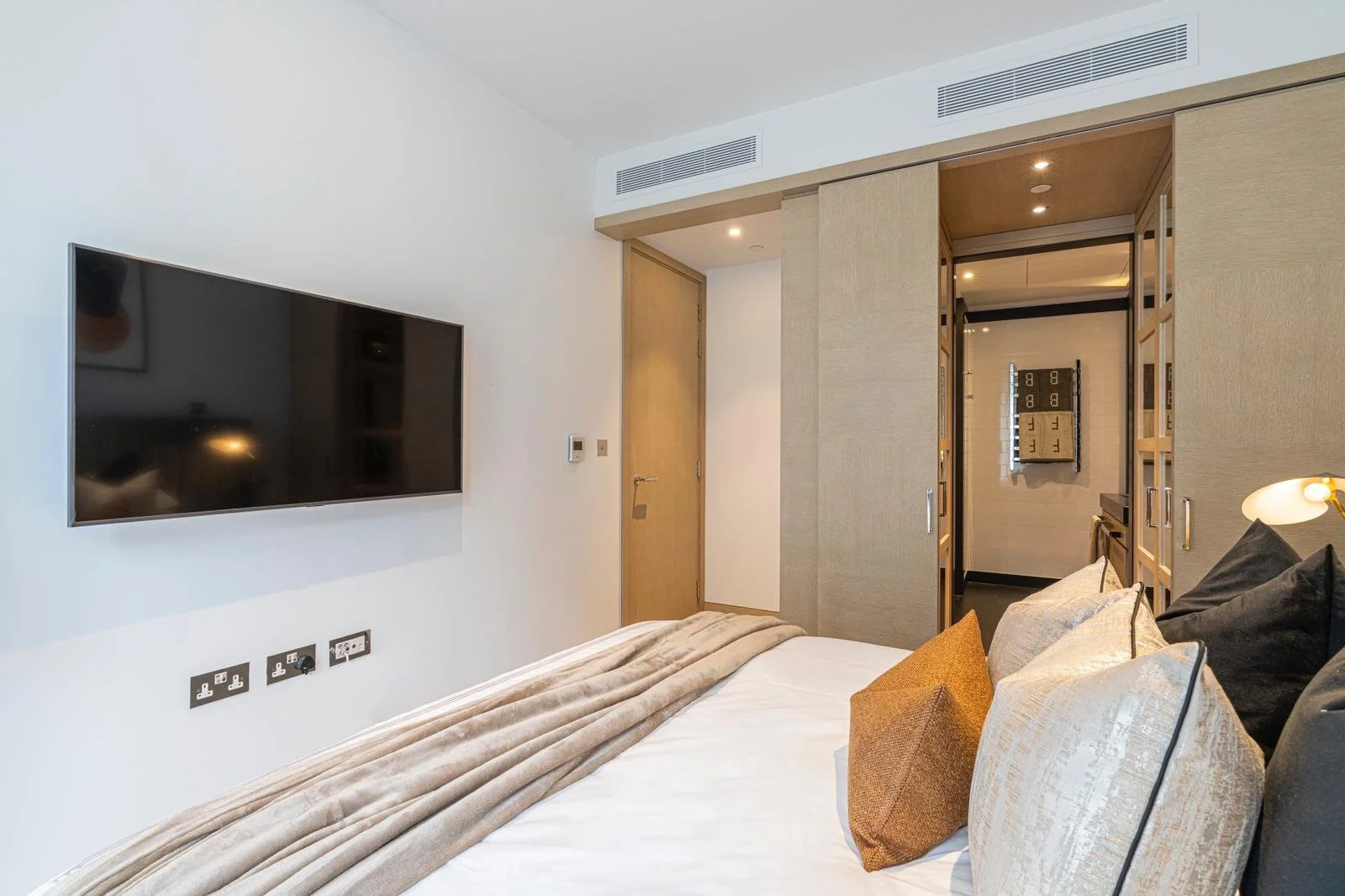 This luxury two-bedroom apartment with a balcony located in a prestigious new development in Nine Elms is the perfect London getaway. The development is located on the riverside of the new quarter of Nine Elms. Vauxhall and the newly opened Nine Elms Underground Station are within easy reach. The apartment comes with two decent-sized bedrooms with double beds, an en-suite master bedroom and a modern kitchen with all the necessary mod cons. It benefits from a high standard specification such as a bespoke built-in kitchen, bespoke bathrooms, built-in wardrobes, an air cooling system throughout the apartment, and a smart TV with all the binge-worthy streaming services.